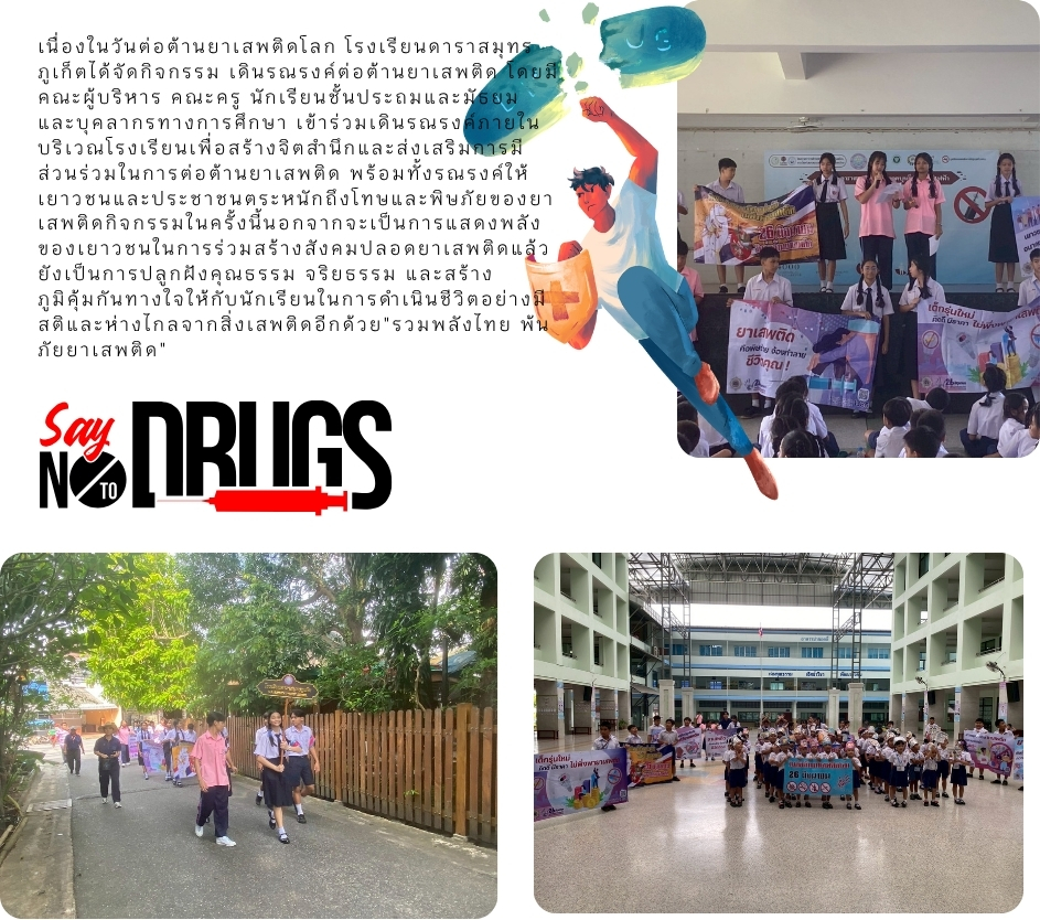โรงเรียนดาราสมุทรภูเก็ตได้จัดกิจกรรม เดินรณรงค์ต่อต้านยาเสพติด โดยมีคณะผู้บริหาร คณะครู นักเรียนชั้นประถมและมัธยม และบุคลากรทางการศึกษา เข้าร่วมเดินรณรงค์ภายในบริเวณโรงเรียนเพื่อสร้างจิตสำนึกและส่งเสริมการมีส่วนร่วมในการต่อต้านยาเสพติด